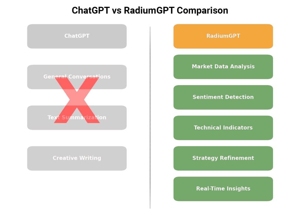 While ChatGPT excels in general-purpose conversations, creative writing, and summarization tasks, RadiumGPT is purpose-built for traders. Designed to provide actionable insights, RadiumGPT focuses on real-time market data analysis, sentiment detection, technical indicators, and strategy refinement—giving you the tools needed to navigate and succeed in financial markets.